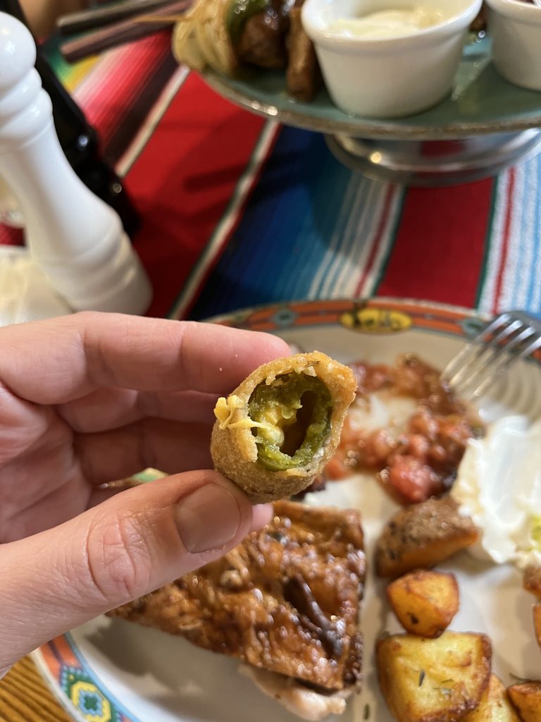 No dobra, zaskoczenia były trzy. Faszerowana serem papryka jalapenos panierowana i smażona, o tak, to też było bardzo dobre. Ale znów, uważam, że nie do końca to smak meksyku. Zabrakło mi trochę ostrości. Mam przeciętną tolerancję na ostre smaki i zdarzało mi się, że przy niektórych potrawach łzy leciały mi po policzku jakbym właśnie oglądał „Niewolnicę Izaurę”. Ale te papryczki oznaczone w menu jako ostre 3/3 nie zrobiły żadnego wrażenia na moich receptorach bólu. Myślałem, że po pierwszym gryzie będę potrzebował gaśnicy do ugaszenia pożaru w moim przełyku. Przygotowałem nawet telefon, żeby móc zadzwonić po straż pożarną. Nic z tych rzeczy. Widocznie kucharz pomylił papryczki. Było smaczne nadzienie z sera i przyjemnie chrupiąca panierka, ale jako całość z ostrością nie miało wiele wspólnego.