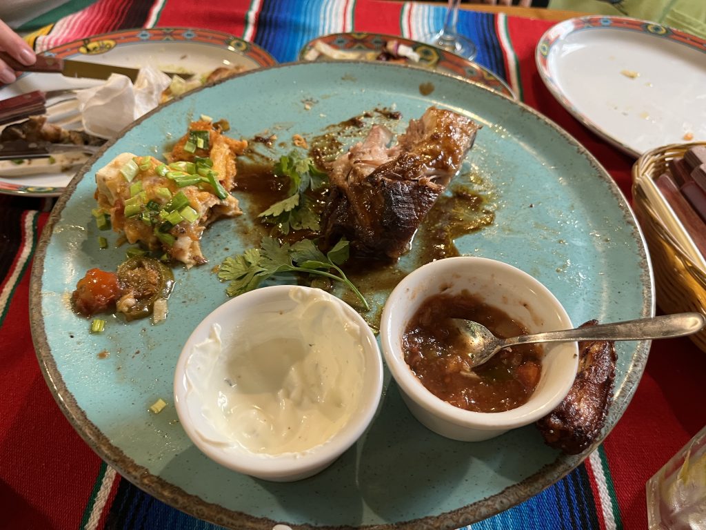 I tak po kilku chwilach oczekiwania na nasz stół wjechały ogromne talerze pełne pachnącego jedzenia. Pachniało cudownie, wyglądało równie świetnie. Smakowało dobrze. Nie wybitnie ale dobrze. Nie zrozumcie mnie źle, ale większość tych smaków już znałem. Wymyśliłem sobie obiad w stylu meksykańskim, żeby odkryć coś nowego a dostałem to co już gdzieś tam jadłem, a nie przypominam sobie, żebym był kiedyś w Meksyku. I jestem na sto procent pewien, że gdybym był, to bym pamiętał. Po prostu większość tych potraw smakowała jak inne znane mi dania, tylko inaczej się nazywały i trochę inaczej wyglądały. Wiem, że kuchnia meksykańska smakuje podobnie do teksańskiej, ale myślałem, że odkryję coś nowego. Takim prawdziwym zaskoczeniem było tacos wegetariańskie. Jestem mięsożerny i na dźwięk słowa „wegetarianizm”stają mi włosy na nogach, ale te tacos bez grama mięsa były genialne! Marynowana cebula, awokado, świeże zioła i sos, ktoś tak cudownie połączył, że jedząc je byłem gotów wytatuować sobie na pośladku napis I❤️ Wege i przerzucić się na stringi, żeby wszyscy go widzieli.